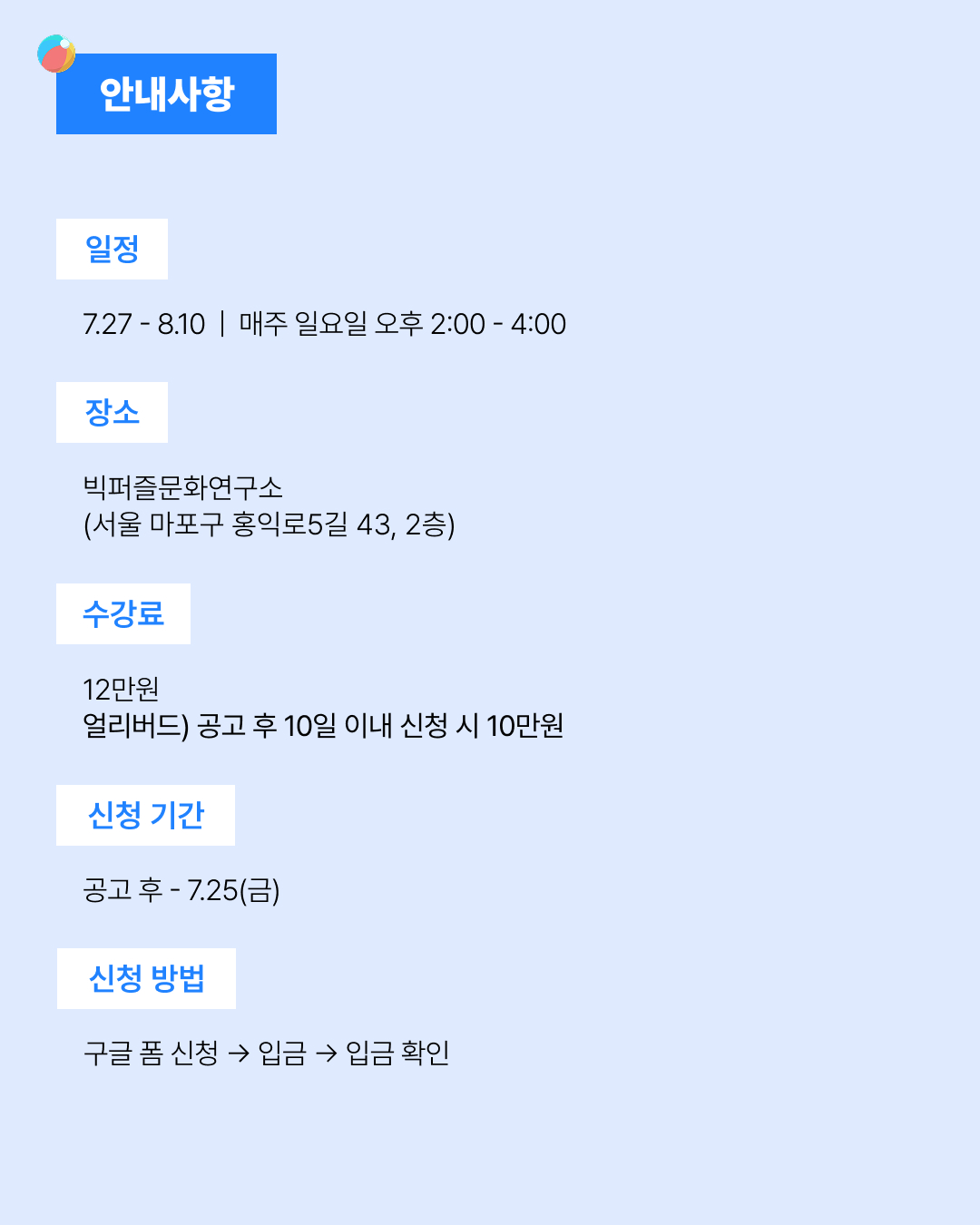 ○ 수강료: 강의당 12만원 | 얼리버드 신청시 10만원